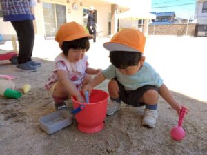 砂場では型押しやスコップを使って、砂をすくったりと、じっくり遊んでいます✨